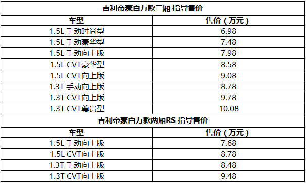 日前,吉利汽车官方宣布,吉利帝豪百万款(包括三厢和两厢RS)正式上市,售价区间为6.98-10.08万元。新车基于2016款帝豪车型打造,采用了经过重新设计的外观和内饰造型,并对配置进行了升级。详细售价请见下表: