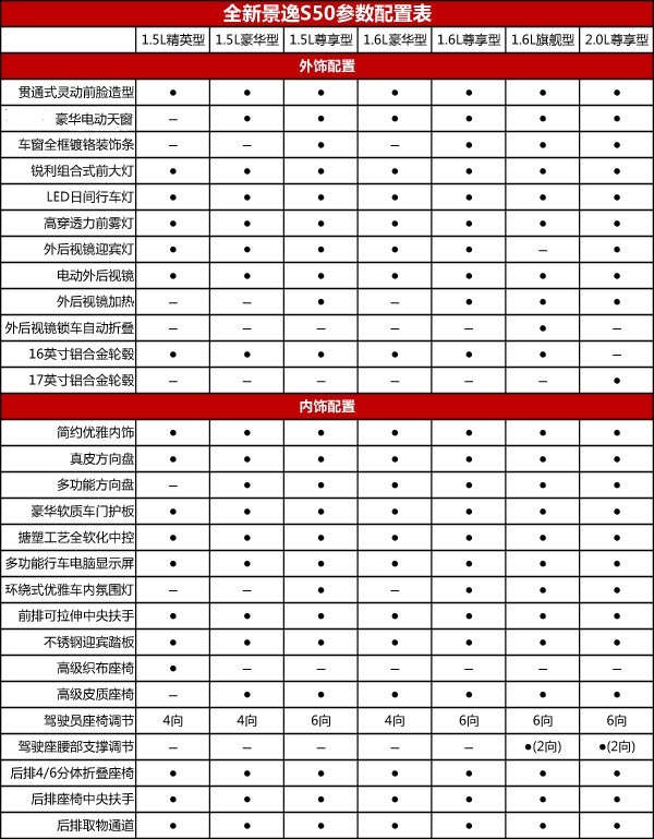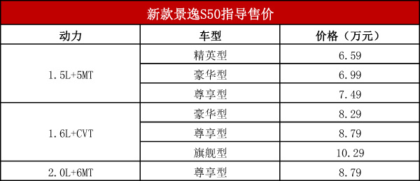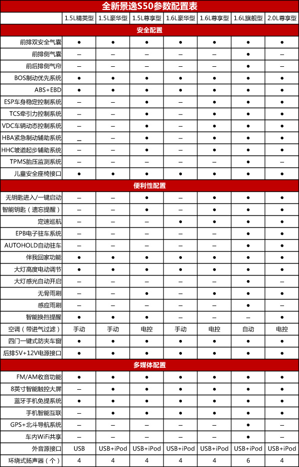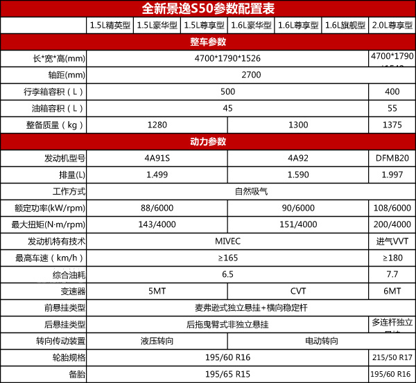 附:新款景逸S50详细配置表