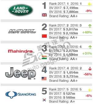 作为汽车行业增长最快的车型,2016年前三个季度SUV的销量同比增长33%。在SUV品牌排名当中,路虎以72亿美元的品牌价值居首。哈弗以30亿美元的品牌价值排在第二位。马恒达和Jeep分别以20.76亿美元和16.54亿美元的品牌价值排在三四位。韩国品牌双龙则以5.27亿美元的品牌价值位列第五位。