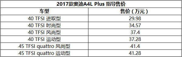 近日,奥迪官方宣布旗下2017款奥迪A4L Plus车型正式上市,新车推出6款车型,售价区间为29.98-41.28万元。
