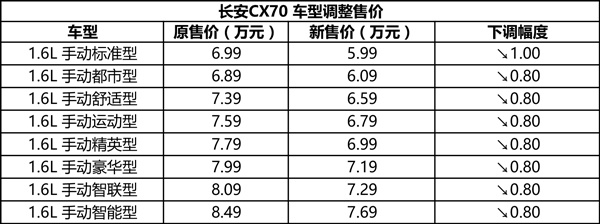 日前我们从官方获悉,长安CX70全系车型展开官降,讲价幅度为0.8-1万元,新车调整后指导价为5.99-7.69万元,新售价详见下表: