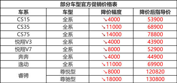 日前,据官方官方消息,长安旗下CS15、CS35、CS75、逸动、睿骋、悦翔V7、悦翔V3、奔奔部分车型进行官降,降价幅度最高达1.8万元。