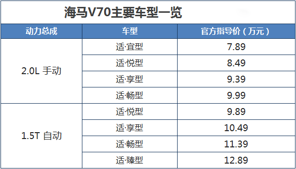 动力方面,海马V70搭载1.5T和2.0L两款发动机。其中1.5T发动机最大功率115kW/5500rpm,峰值扭矩为220Nm/1800-4000rpm,匹配六速手自一体变速箱。2.0L发动机最大功率为112kW/6000rpm,峰值扭矩为185Nm/4000rpm,匹配六速手动变速箱。